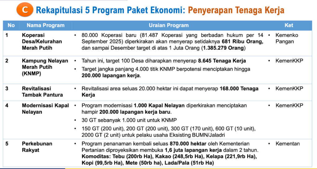 - Koperasi Desa/Kelurahan Merah Putih: Target 80.000 koperasi baru menyerap lebih dari 1,38 juta orang hingga Desember 2025.