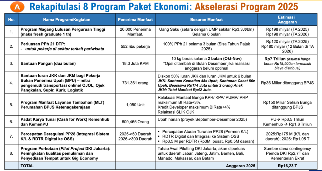 Mengutip laporan BBC News Indonesia, pemerintah Indonesia menghadirkan 17 program paket stimulus ekonomi yang dikenal sebagai “Paket Stimulus Ekonomi 8+4+5”, dengan total alokasi dana mencapai Rp16,23 triliun. Paket ini dirancang untuk mendorong pertumbuhan ekonomi nasional, dengan target 5,2 persen pada akhir 2025.