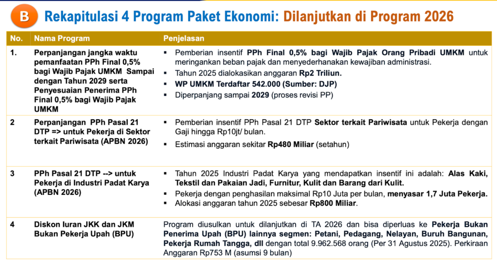 Pemerintah Indonesia akan melanjutkan empat program penting dari Paket Ekonomi 2025 ke dalam program 2026, dengan fokus pada sektor pajak dan tenaga kerja. Langkah ini bertujuan untuk memperkuat pemulihan ekonomi, meringankan beban masyarakat, serta mendorong pertumbuhan sektor produktif.